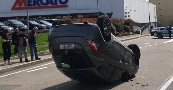 Prima ha tamponato la Mercedes Classe A che viaggiava davanti a lei, poi si è ribaltata in mezzo alla carreggiata. È successo intorno alle 11,30 a Chieri, all’incrocio tra piazza Europa e via Conte Rossi di Montelera.