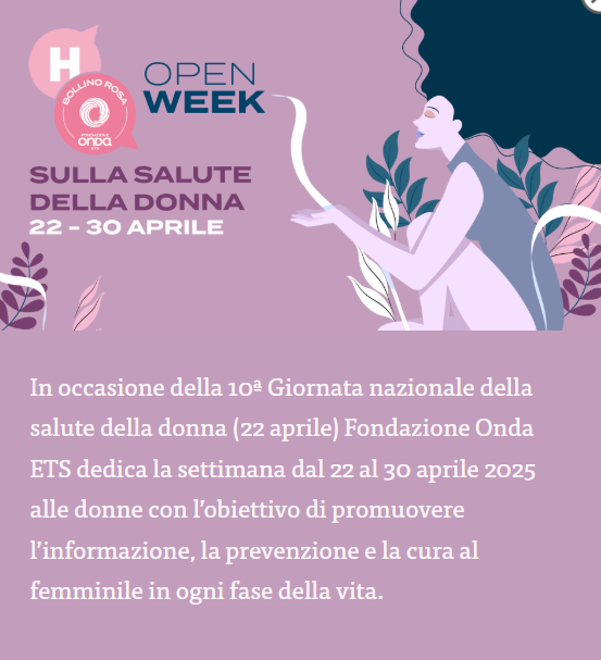 Dal 22 al 30 aprile, in occasione della Giornata nazionale della salute della donna che si celebra il 22 aprile, torna l’(H) Open Week, l’iniziativa promossa da Fondazione Onda ETS per sensibilizzare sull’importanza della prevenzione, dell’informazione e della cura in ambito femminile.