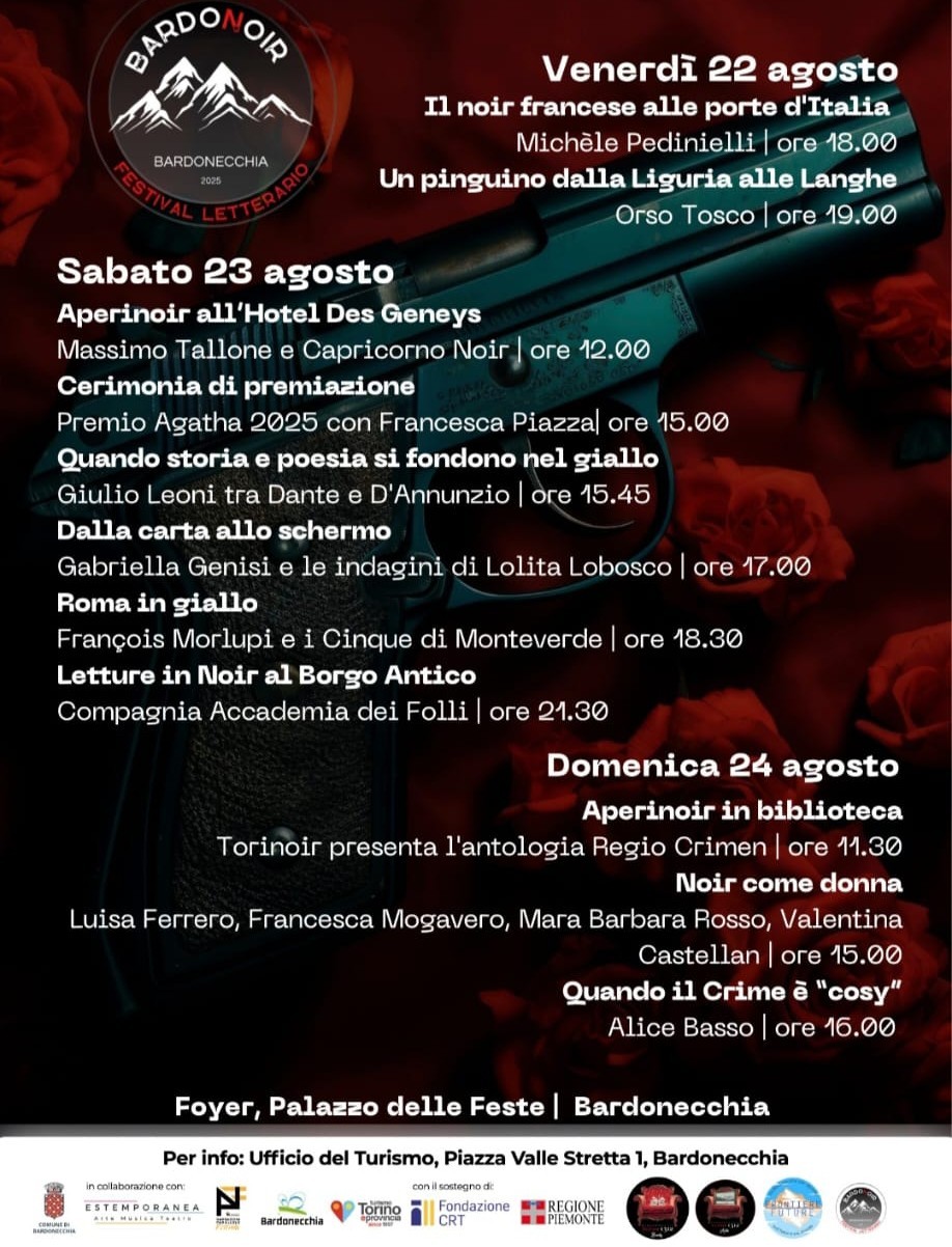 Sabato 23 il programma sarà fitto: alle 12 aperitivo con il torinese Massimo Tallone e la sua nuova opera noir per Capricorno Edizioni. Alle 15 Bardonoir ospiterà una novità assoluta, la cerimonia del Premio Agatha 2025, concorso ideato dalla rivista Agatha e da Golem Edizioni per racconti noir al femminile ambientati in montagna o nelle terre di frontiera. Seguiranno gli incontri con Giulio Leoni, maestro del giallo storico, e due firme di spicco: Gabriella Genisi, creatrice di Lolita Lobosco, e François Morlupi con la sua Roma noir. La giornata si chiuderà con le letture teatrali dell’Accademia dei Folli nel Borgo Vecchio.