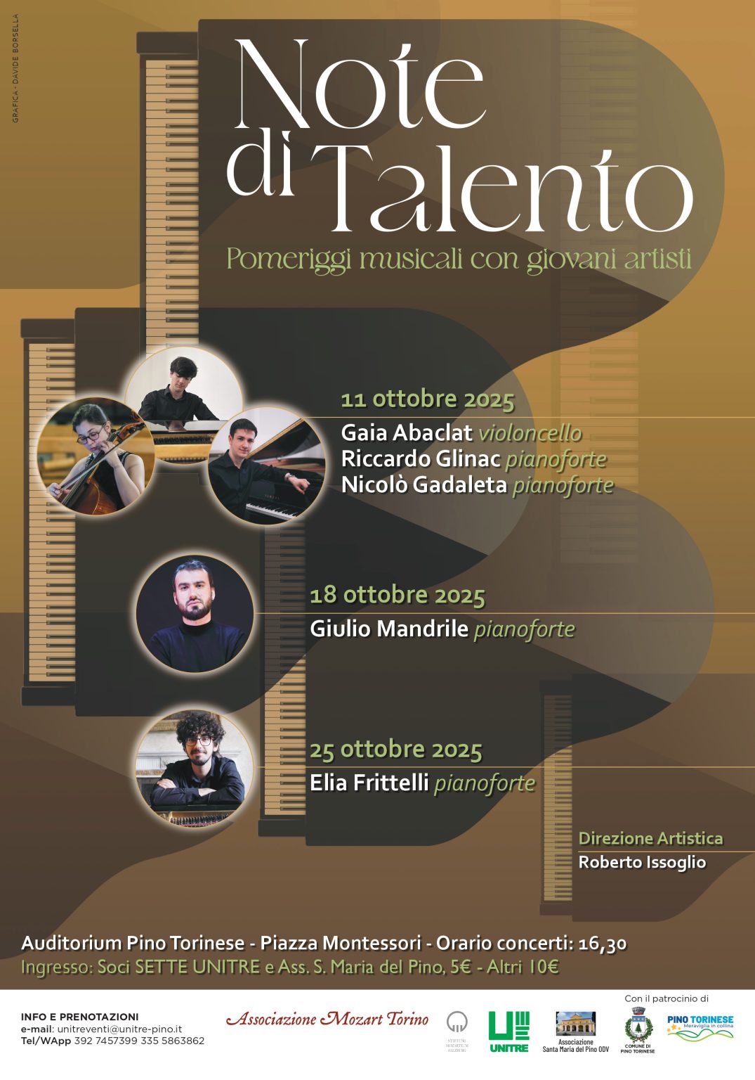 A Pino Torinese prende il via “Note di Talento”, la rassegna musicale organizzata dall’Associazione Mozart Torino in collaborazione con l’Unitre Pino Torinese e l’Associazione Santa Maria del Pino, con il patrocinio del Comune.