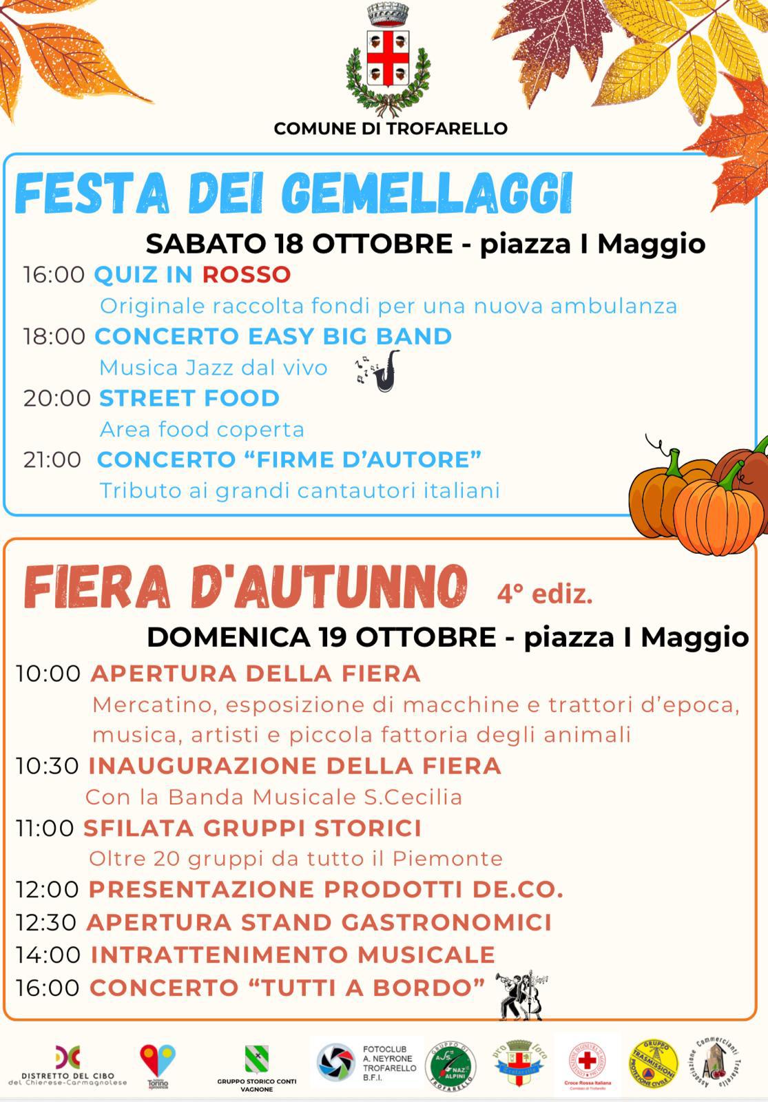Trofarello si prepara a vivere un weekend speciale all’insegna di musica, cultura, solidarietà e tradizione. Sabato 18 e domenica 19 ottobre, Piazza Primo Maggio e il centro cittadino ospiteranno la Festa dei Gemellaggi e la Fiera d’Autunno, due eventi che da anni rappresentano momenti di grande partecipazione per la comunità locale.