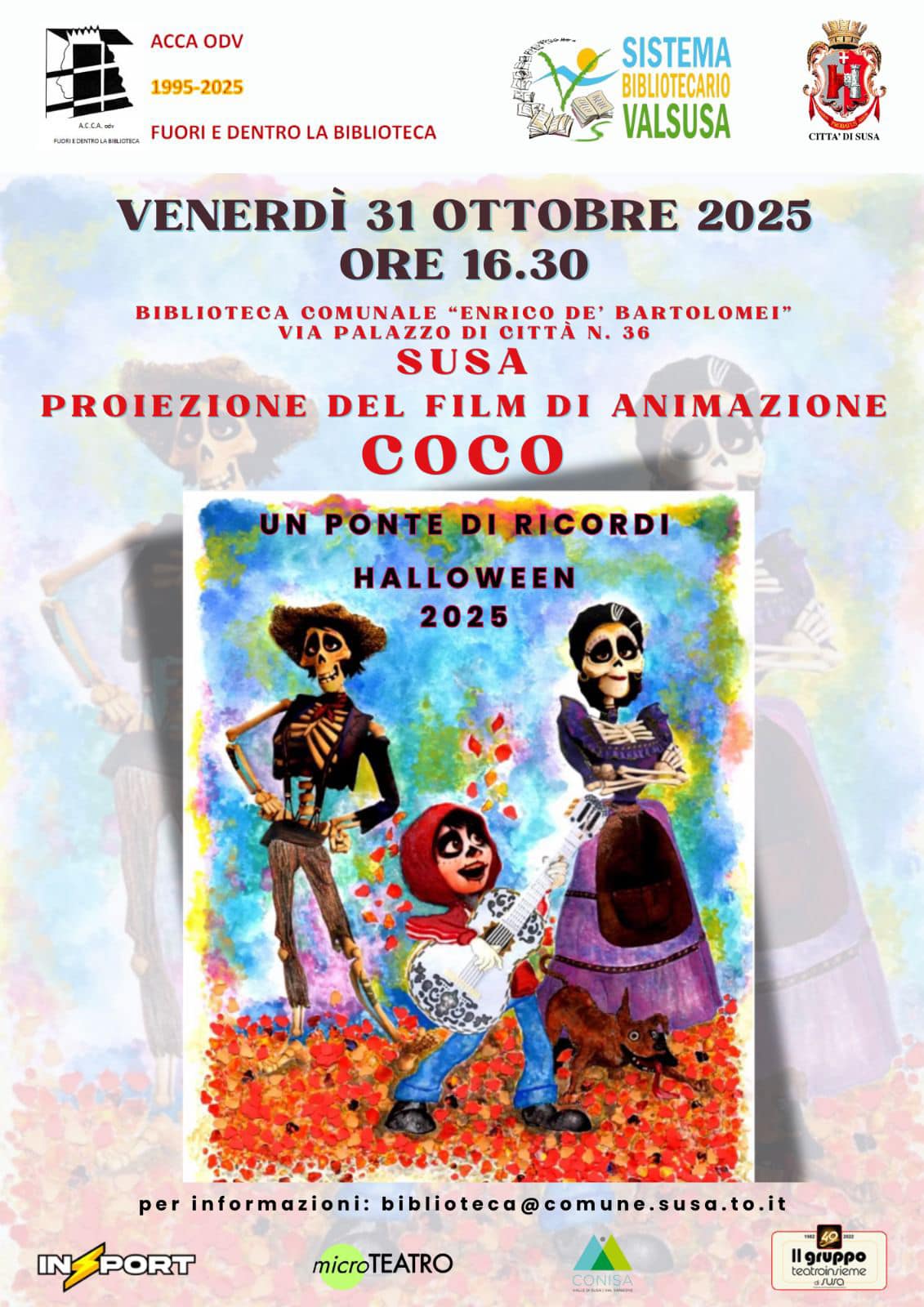 La prima proposta arriva dalla Biblioteca comunale “Enrico De’ Bartolomei”, che venerdì 31 ottobre alle 16.30, in collaborazione con l’associazione Acca odv e il Sistema Bibliotecario Valsusa, ospiterà la proiezione del film d’animazione “Coco – Un ponte di ricordi”. Un appuntamento gratuito pensato per famiglie e bambini, che attraverso la storia del piccolo Miguel farà scoprire le usanze e i simboli di altre culture, come la tradizione messicana del Día de los Muertos.