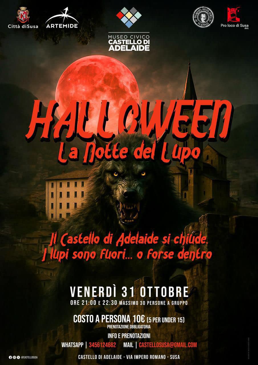 La seconda opportunità è dedicata agli amanti del brivido. Dalle 21.00 e alle 22.30, il Castello di Adelaide aprirà le sue porte per “Halloween – La Notte del Lupo”, evento organizzato dalla Pro Loco di Susa insieme a Artemide, Sagiat e al Museo Civico. Un percorso notturno guidato tra spettri, lupi e figure misteriose che accompagneranno i visitatori in un viaggio suggestivo. Ogni gruppo potrà essere composto da un massimo di 30 persone; il costo del biglietto è di 10 euro (5 euro per i minori di 15 anni) e la prenotazione è obbligatoria tramite WhatsApp al numero 345 6124682 o all’indirizzo castellosusa@gmail.com.