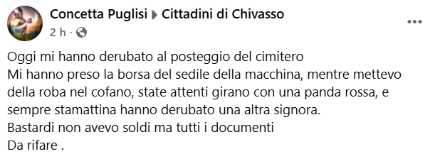 Ancora un episodio di furto nella zona del cimitero comunale di Chivasso. Una donna è stata derubata nel corso della mattinata mentre sistemava la spesa nel bagagliaio della propria auto. La vittima ha raccontato l’accaduto su Facebook, sulla pagina “Cittadini di Chivasso”, attirando rapidamente numerosi commenti e segnalazioni.