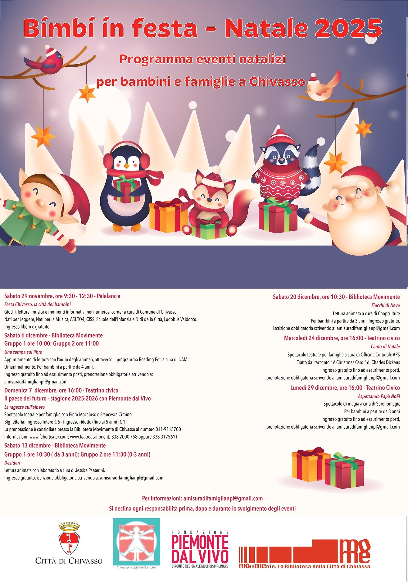 L’iniziativa, diventata un appuntamento tradizionale per la città, vede la collaborazione della Biblioteca Movimente con il programma Nati per Leggere, dell’Istituto Musicale Comunale “Leone Sinigaglia” con Nati per la Musica, dell’ASL TO4, del CISS, dei Nidi e delle Scuole dell’Infanzia coinvolte nel progetto Chivasso Città dei Bambini.