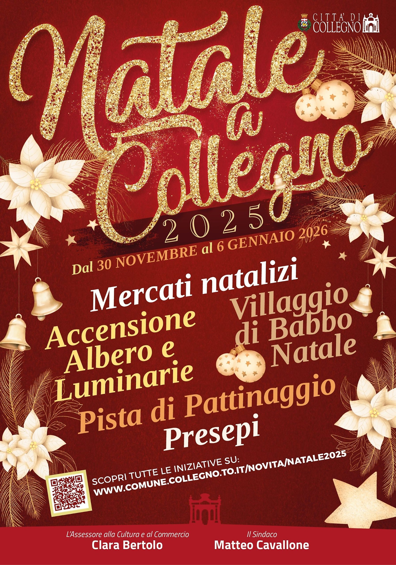Per Collegno, il Natale entrerà davvero nel vivo proprio da questa domenica. Piazza IV Novembre si trasformerà in un grande Villaggio di Babbo Natale con mercatino, mostra fotografica, laboratori creativi, musica itinerante e l’apertura dei presepi cittadini, dalla Chiesa di Santa Croce a Villa Licia fino alla Sala delle Arti. La settimana successiva si apriranno i primi appuntamenti culturali, tra cui il concerto dell’Orchestra Fiati alla Lavanderia a Vapore il 5 dicembre, mentre dal giorno seguente fino all’Epifania sarà in funzione la pista di pattinaggio in piazza del Municipio.