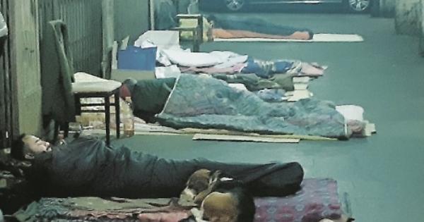 Alcuni clochard davanti alle serrande chiuse di via Conte Verde