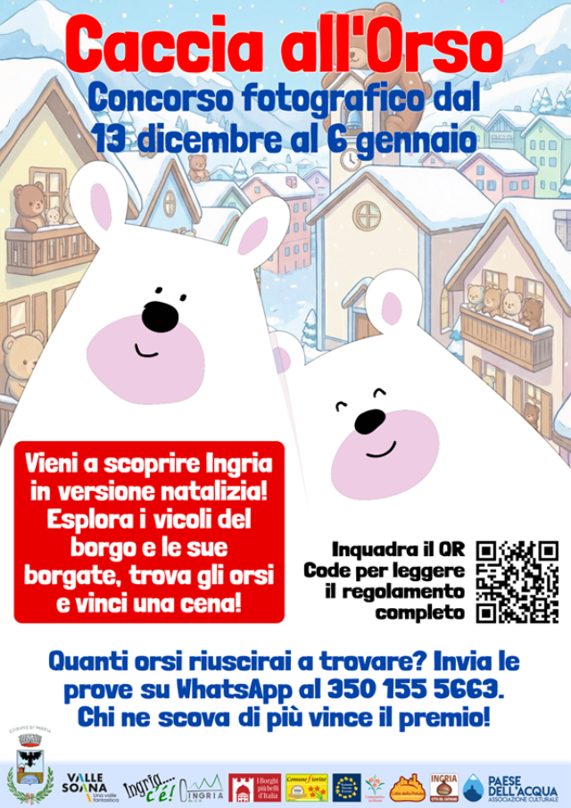 Partecipate a questa sfida fotografica e cercate di "catturare" il maggior numero di orsi di peluche esposti nel nostro Capoluogo e nelle sue Frazioni! I orsi dovranno essere fotografati e descritti: ogni singola foto dovrà infatti essere accompagnata dall'elenco degli orsi individuati; il concorso vale su tutto il territorio di Ingria. Il vincitore riceverà una cena per 2 persone al ristorante Pont Viei.