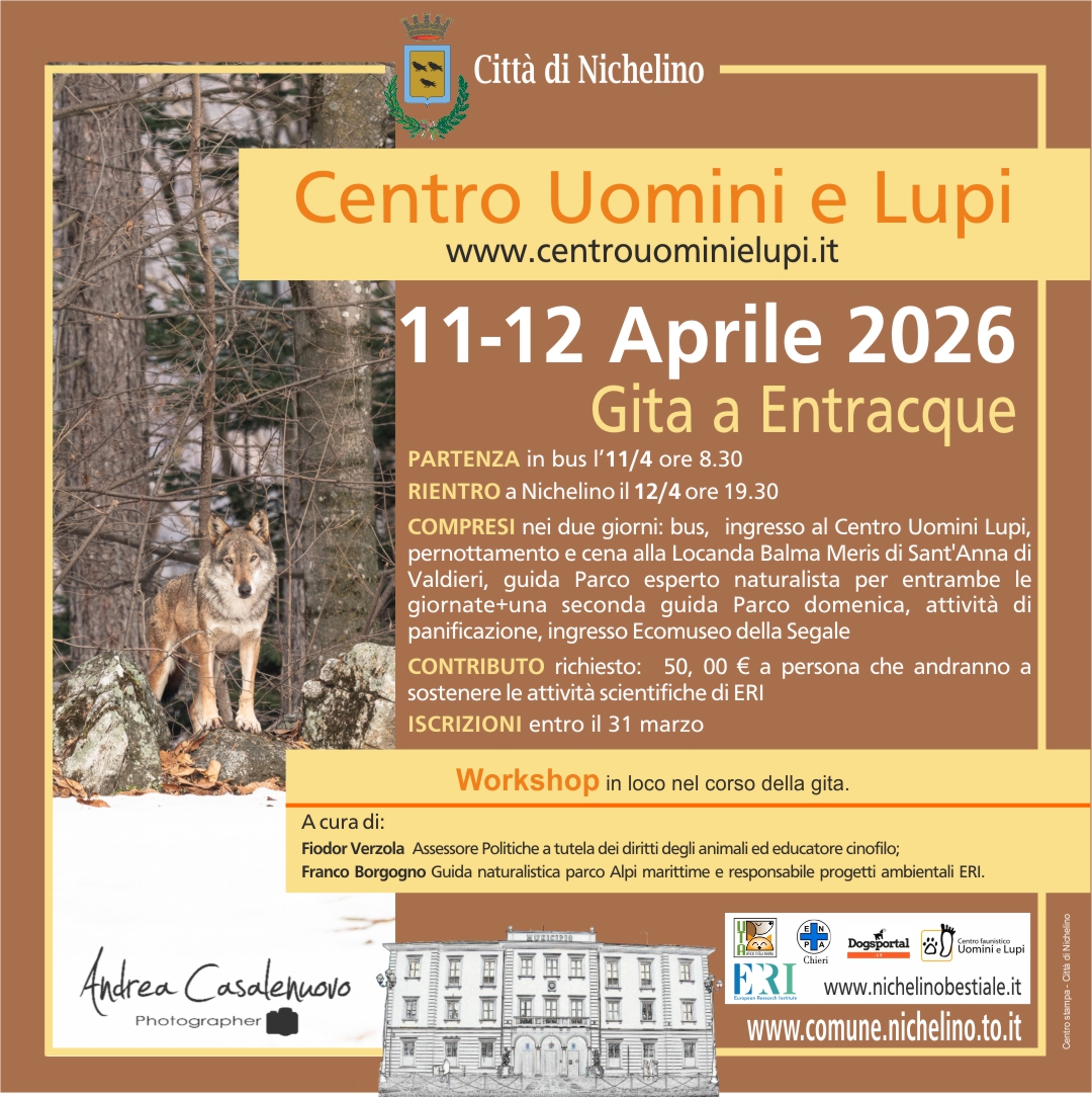 La Città di Nichelino organizza per sabato 11 e domenica 12 aprile 2026 una gita di due giorni al Centro Uomini e Lupi di Entracque, un’occasione unica per vivere da vicino la natura e approfondire la conoscenza di questi straordinari animali.
