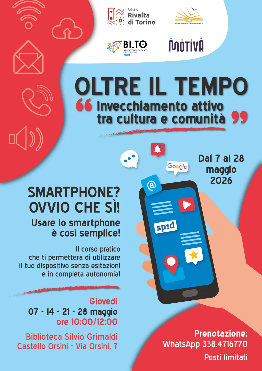 Il progetto, promosso dal Comune di Rivalta di Torino nell’ambito dell’iniziativa “Oltre il tempo: invecchiamento attivo tra cultura e comunità”, punta a offrire strumenti utili per superare le difficoltà più comuni legate all’uso dei dispositivi mobili.