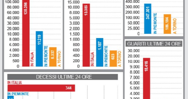 Il totale è ora di 11.219 deceduti risultati positivi al virus, così suddivisi per provincia: 1.530 Alessandria, 693 Asti, 418 Biella, 1.371 Cuneo, 922 Novara, 5.337 Torino, 496 Vercelli, 361 Verbano-Cusio-Ossola, oltre a 91 residenti fuori regione, ma deceduti in Piemonte.