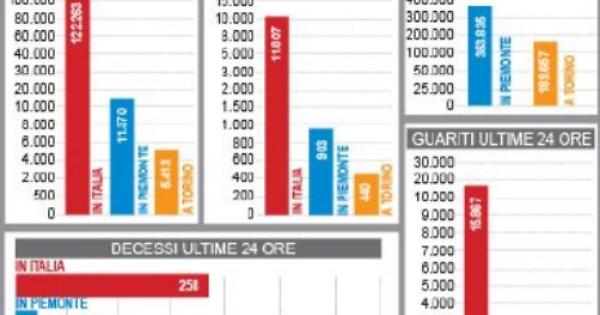 Il totale è ora di 11.370 deceduti risultati positivi al virus, così suddivisi per provincia: 1.539 Alessandria, 695 Asti, 422 Biella, 1.408 Cuneo, 930 Novara, 5.413 Torino, 505 Vercelli, 365 Verbano-Cusio-Ossola, oltre a 93 residenti fuori regione, ma deceduti in Piemonte.