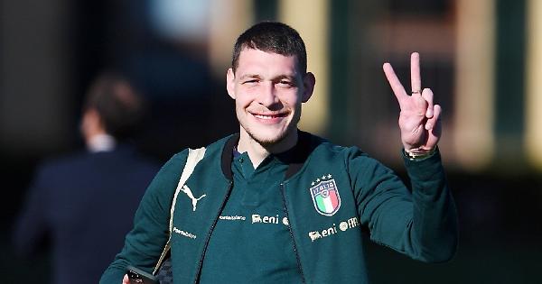 Andrea Belotti sorridente al raduno azzurro a Coverciano