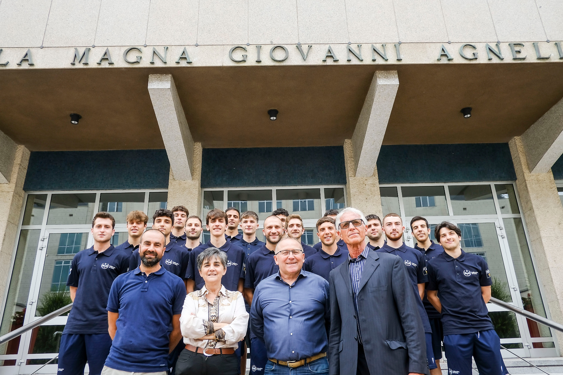La Rappresentativa del Politecnico insieme a Giancarlo Camolese, la prorettrice del Politecnico di Torino Laura Montanaro e il presidente del Cus Torino Riccardo D'Elicio