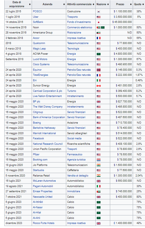 Il Public Investment Fund di Riad è stato creato nel 1971, ma soltanto negli ultimi anni, ossia dal 2014 quando ha cominciato a operare al di fuori dei confini nazionali, sotto la guida del principe Salman, ha lanciato una vera e propria offensiva a livello mondiale. Si calcola che abbia un patrimonio di 776 miliardi di dollari.