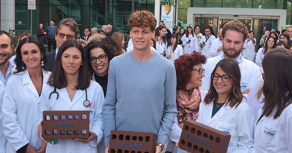Jannik Sinner con i medici e gli infermieri del Centro antitumori di Candiolo