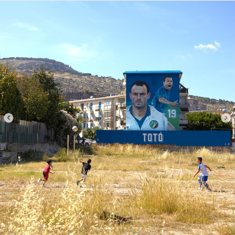 Gli occhi spiritati vegliano così sulla gente del Cep, quartiere popolare di Palermo che lo ha visto crescere sia calcisticamente che umanamente fino a farlo diventare l'eroe di un intero paese ai Mondiali del 1990. Il murale, che si chiama proprio Totò, si affaccia sul campo da calcio del quartiere in cui l'ex stella tra le altre di Messina e Juventus (oltre che naturalmente della Nazionale), morto lo scorso 18 settembre, ha dato i primi tiri a un pallone.