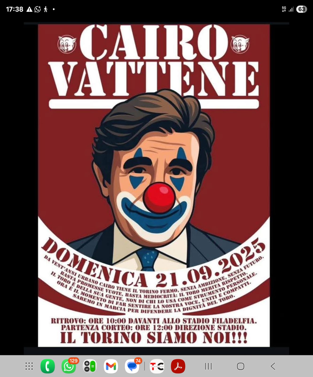 Il motto è sempre lo stesso, "Cairo vattene", così come le modalità di contestazione, una marcia di protesta. Il malumore nei confronti del presidente del Toro non si placa e, anzi, i tifosi si dati nuovamente appuntamento per far sentire la propria voce. Il “volantino” con il volto di Cairo raffigurato come un clown ha già fatto il giro dei social e il tam tam è ufficialmente partito.