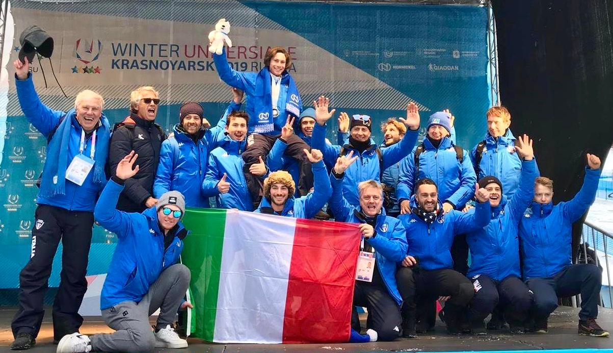 Foto di gruppo alle Universiadi invernali di Krasnojarsk, in Russia, del 2019
