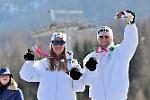 A sinistra, Silvano Joly insieme alla portabandiera di Torino 2006 Melania Corradini. A destra, invece, con Tiziana Nasi sulla pista delle Tofane