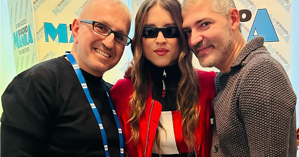 Angelina Mango con Devis Miadò (destra) e Davide Pomponi di Radio Manila