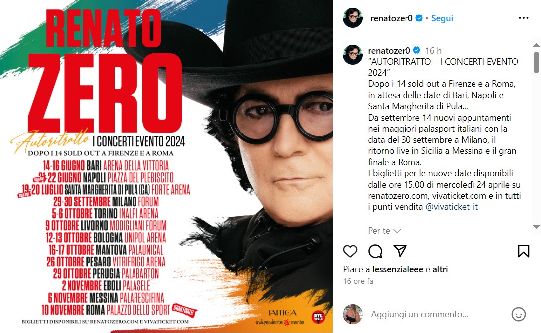E' sempre tempo di Renato Zero perché lui non tramonta mai. La sua poesia, il suo stile piace oggi come ieri e a ogni data è quasi matematicamente sicuro il sold out. Dopo tutta una serie di date outdoor, il re dei Sorcini ha annunciato proprio oggi attraverso la sua pagina Instagram un’avvincente leg autunnale nei più importanti palasport che lo porterà anche a Torino il 5 e 6 ottobre prossimi ospite dell'Inalpi Arena.