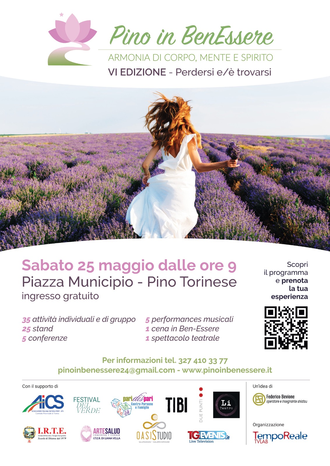 Sabato 25 maggio, dalle 9 alle 23, Pino Torinese ospiterà la sesta edizione del festival "Pino in Ben-essere", un evento dedicato all'equilibrio di mente, corpo e spirito. Organizzato dall'Associazione TempoReale Tv Lab Aps, con il contributo e il patrocinio del Comune di Pino Torinese e della Città Metropolitana di Torino, l'evento offre una giornata di sensibilizzazione e incontro tra diverse discipline e approcci al benessere, ponendosi come aiuto complementare alla medicina convenzionale.