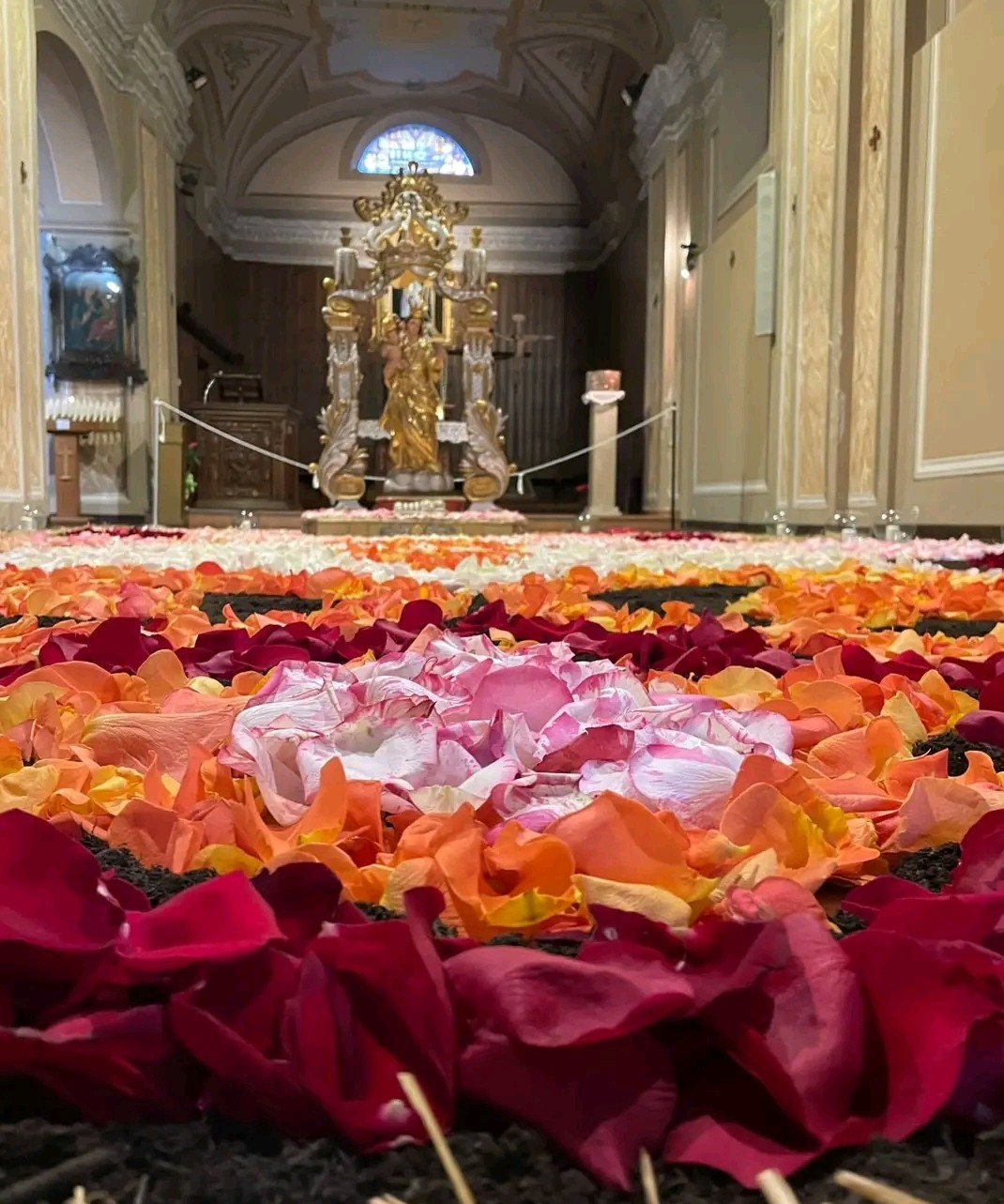 Il pavimento della chiesa di San Giovanni Decollato sarà decorato con un florilegio realizzato con i petali di centinaia di rose di diversi colori, creando un motivo multicromatico che sarà visibile attraverso un corridoio di visita attorno all'opera o grazie alla soprelevazione del soppalco adibito a coro della chiesa. Ma non è tutto: sabato sera, 1 giugno, le luci della cappella si spegneranno e l'Infiorata sarà illuminata da un tripudio di candele, accompagnato da un sottofondo musicale capace di suscitare pura emozione.