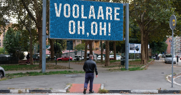 A un primo sguardo, osservando il manifesto, il passante rimarrà colpito da questo enorme blu dipinto di blu. Ma scrutando e studiando meglio l’opera, si noterà che sotto il ritornello spensierato “VOLAARE, OOH” è nascosto il testo dell’articolo 16.1.
