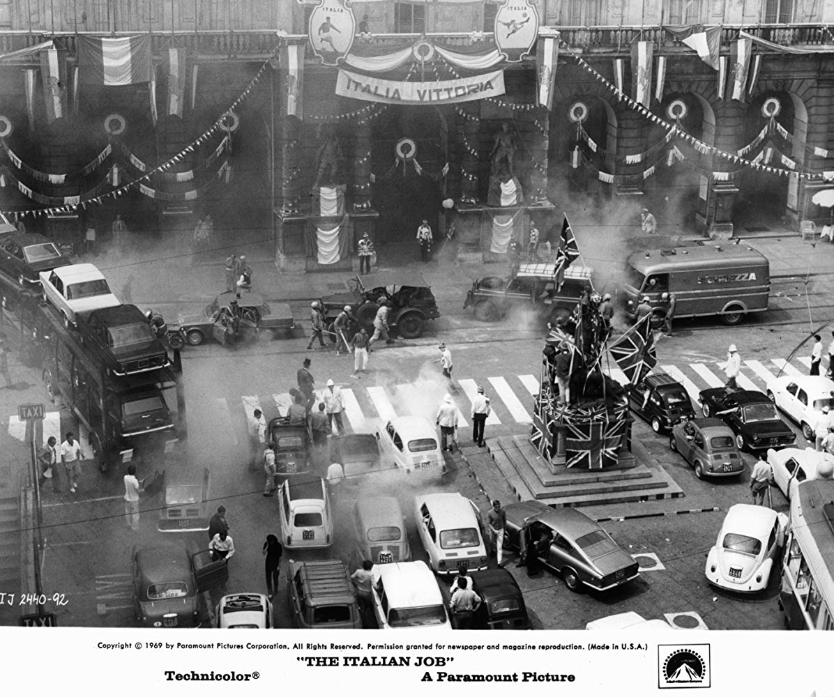 I ladri sullo schermo sfrecciano su tre Mini Cooper (auto inglesi nella città della Fiat!) da Palazzo Lascaris a Palazzo Madama, le macchine fuggono compiendo vere imprese come la discesa dello scalone di Galleria Subalpina, per poi andare sotto i porti di piazza Vittorio, sbucare in via Roma ed entrare in Galleria San Federico, imboccare il sottopasso di porta Nuova (non esiste più ora, ma i meno giovani lo ricordano bene), fare le scale della Gran Madre e risalire sul tetto del Palavela, oltre ai Murazzi e molti altri posti. Una delle sequenze più spettacolari, come detto, sarà invece proprio sulla Pista 500 (per poi spostarsi fuori città fino al parco del Gran Paradiso). Un film di rapina come tanti, sulla carta, ma che dopo oltre mezzo secolo continua a essere ricordato (e riguardato) con piacere: vederlo nei pressi della parabolica della Pista 500 è un’occasione preziosa, da non mancare (i posti disponibili sono circa 140).