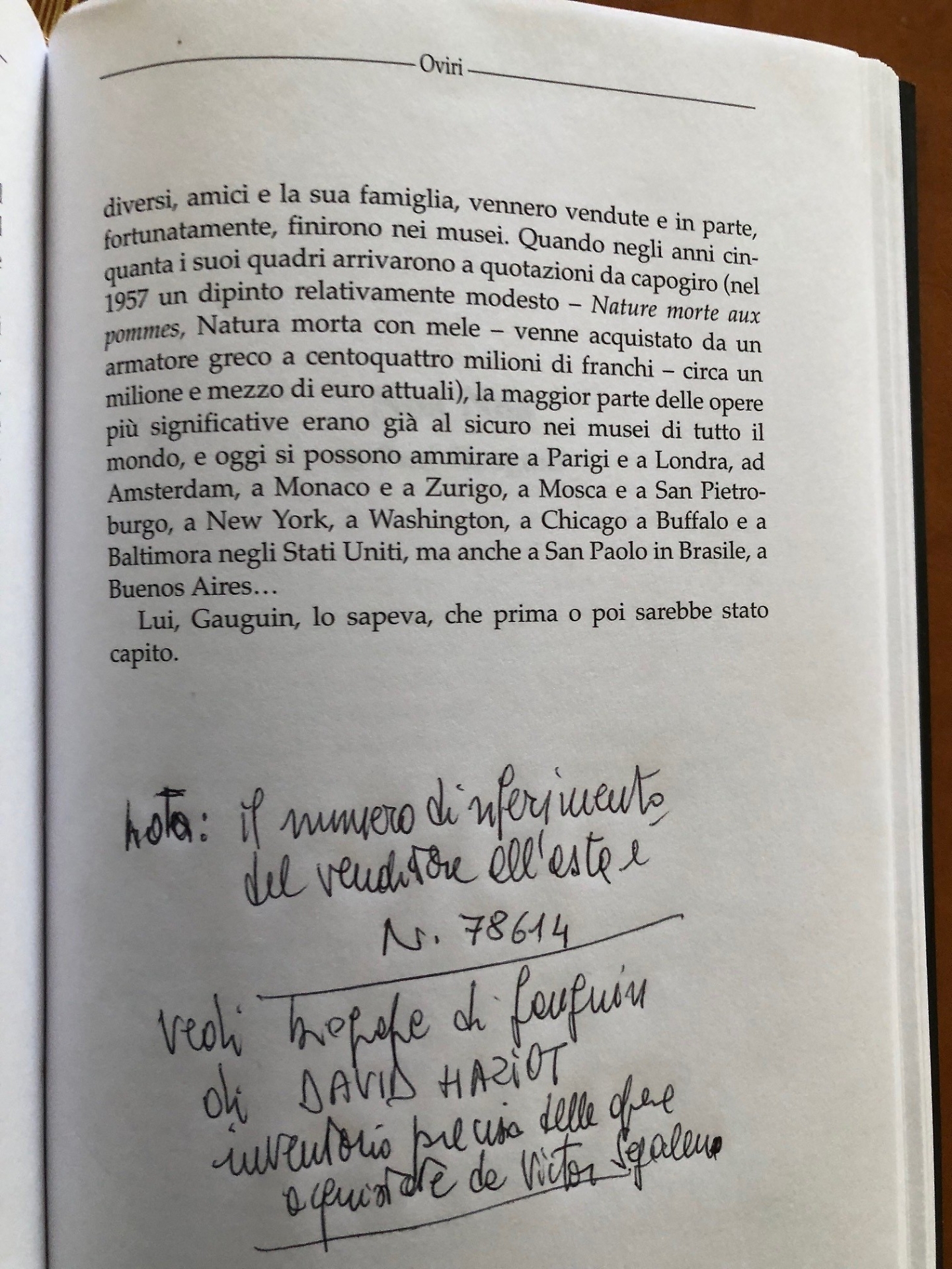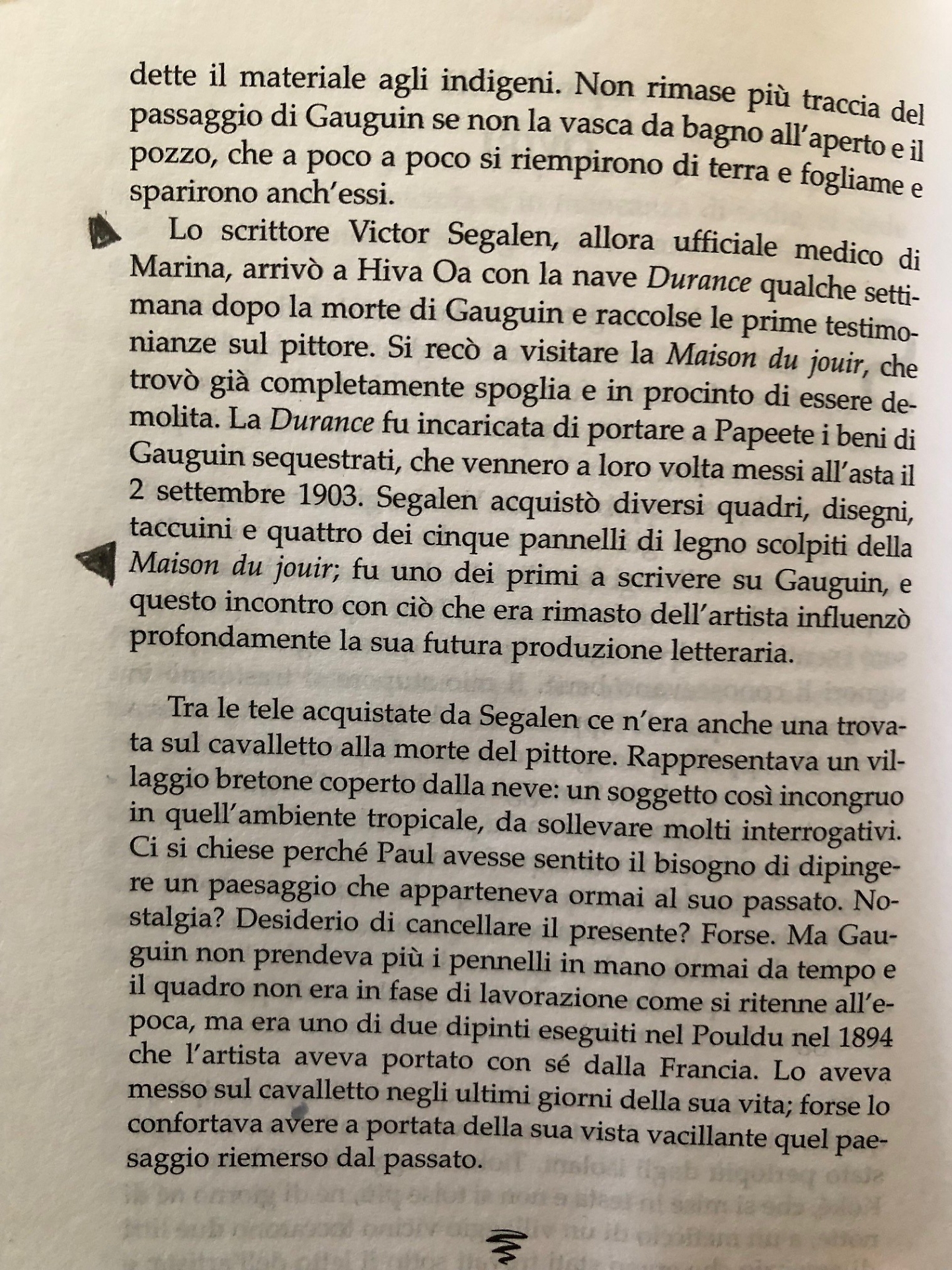 “Chapeau!” esclamò uno dei due ospiti sul terrazzo del Prof. Vincenzo Assetto, che ben aveva ammirato questa tavola lignea senza profferire parola. “Mah, …” sbofonchiò suo figlio non volendo vedere il segno “Pg” inciso sopra l’occhio della donna scolpita con una strana espressione di godimento. Io tacqui per buona maniera ma avrei voluto raccontare, nel corso della cena, quanto ora, di seguito, scrivo a buona memoria. Il veliero “Durance” frangeva le lunghe onde dell’oceano con la prua istoriata dalla scultura di Maria Maddalena, una delle tre sorelle protettrici dei naviganti della marina francese alla volta delle isole della Polinesia, protettorato della Francia. Le tre sorelle non a caso dette “les trois soeurs” che, evocate mangiando la zuppa di cavoli servita nel quadrato di poppa in scodelle ricavate dai gusci vuoti delle noci di cocco, accompagnata dalla brodaglia di acqua salata, i marinai imprecavano dal disgusto. Chi pronunciando “le sorelle troie”, chi disperando della loro protezione essendosi imbarcati con la speranza di trovare un tesoro (le trésor) nelle lontane isole paradisiache dove le donne esponevano le tette al vento e accoglievano i marinai per fare all’amore sotto le palme e la luna. Così si raccontavano i marinai cantando canzoni patriottiche, che con i loro sogni erotici c’entravano ben poco. Tra loro un ufficiale, nella sua sdrucida divisa della marina militare, dopo più di un mese di navigazione senza ricambi. I grandi risvolti bianchi ai polsi avevano preso la tinta delle acciughe pescate a strascico ogni volta che dal pennone il marinaio esperto avvistava i delfini. L’ufficiale si chiamava Victor Segalen, detto Segalin, di origine veneziana, con una famiglia di navigatori e una laurea in medicina alla Sorbona: un ufficiale medico necessario in un bastimento di linea per Tahiti. Quel giorno il mare mosso era causato dalla luna piena, che governa le maree come il ciclo mestruale delle indigene. Quando la scialuppa attraccò all’isola di Hira Oa, Segalen non fu accolto da donne procaci, ma da due gendarmi francesi, che lo condussero all’asta dei beni della “Maison de Jouir” appartenuti al pittore Paul Gauguin, morto pochi giorni prima. La popolazione locale derideva le pitture di Gauguin, benché alcune tele fossero già state acquistate da residenti francesi. Il 2 settembre 1904 il battitore dell’asta faticava a vendere le opere, ritenute visionarie e scandalose, tanto che il gendarme dovette puntare il fucile contro Segalen per obbligarlo a comprare alcuni pezzi: uno specchio con cornice scolpita e una tavola lignea incisa con un ricordo personale di Gauguin. In quell’opera, Gauguin si scolpì con la futura moglie Mette Gad durante un orgasmo condiviso, rappresentando un rituale danese. La sua forza fisica proveniva dalla nonna Flora Tristan, nipote del Re del Perù e scrittrice socialista, avvelenata nel 1884 a Bordeaux dopo una conferenza. L’autenticità dell’opera fu confermata dal comandante, che indicava con l’indice il marchio “Pg” di Gauguin posto sull’occhio della donna, forse per distrarre le suore presenti e riluttanti ad ammirare altri particolari.
