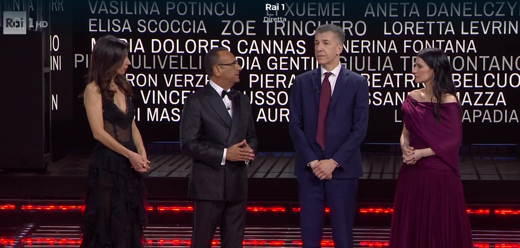 - ORE 20.55: Laura Pausini scende le scalinate sul motivetto de "La Solitudine", raggiungendo il conduttore: "Let'go Carlo Conti". Ora tocca a Chiello, codice 02.