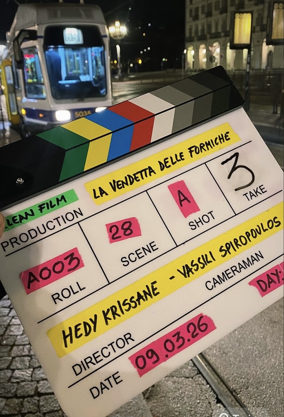 «Siamo felici ma un po’ stanchi, dopo le prime settimane di riprese: girare sempre di notte, iniziando alle 19 circa e concludendo anche dopo le 3, è bello perché Torino è meravigliosa ma anche un po’ sfiancante. Abbiamo le giuste energie per farcela, il clima sul set è fantastico e c’è una bellissima relazione tra noi e il cast artistico e tecnico più giovane», sottolinea Messerklinger, qui nel ruolo di una poliziotta (con Sorrentino era invece un’ergastolana) accanto a Costantino Comito. La storia del film parte da un’aggressione a sfondo razziale che scuote la vita di una tranquilla famiglia di immigrati: una piccola bugia mette in crisi la fragile convivenza tra la prima generazione, ancorata alle sue tradizioni e la seconda, in bilico tra le due identità. “La vendetta delle formiche” è sostenuto dalla Film Commission Torino Piemonte: «Per una produzione piccola come la nostra è un aiuto fondamentale, non solo economico ma anche pratico», aggiunge Krissane, anche produttore insieme a Saverio Pilò e la loro Clean Film (collaborano anche La Bottega dell’Immagine e Ciakalabria). «Dopo tanti anni è stata l’unica scelta, tanti produttori leggevano la sceneggiatura, mi facevano un sacco di complimenti ma poi qualcosa andava storto: forse ora è il momento giusto per una storia così». Linda Messerklinger sottolinea anche che «la decisione di accettare questo ruolo nasce dalla sincerità del regista, la purezza della sua intenzione, la sua esigenza di trattare questo tema e condividere le sue esperienze di vita».
