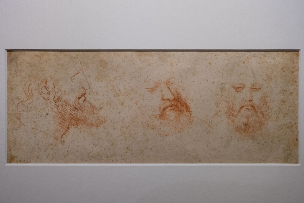 Tre teste, rappresentate una di seguito all’altra, quasi come in una sequenza cinematografica. A destra del foglio è il ritratto frontale, caratterizzato da uno studio particolareggiato del volto, mentre nei due ritratti successivi le dimensioni del viso aumentano e la tecnica si fa meno analitica e più essenziale. Sono le “Tre vedute di testa virile con barba” di Leonardo da Vinci. La pietra rossa su carta, un foglio autografo di 110x283 mm datato 1502 circa, si potrà ammirare, dentro ad una vetrina blindata e climatizzata, fino al 28 giugno prossimo nello Spazio Leonardo allestito al primo piano della Galleria Sabauda dei Musei Reali di Torino.