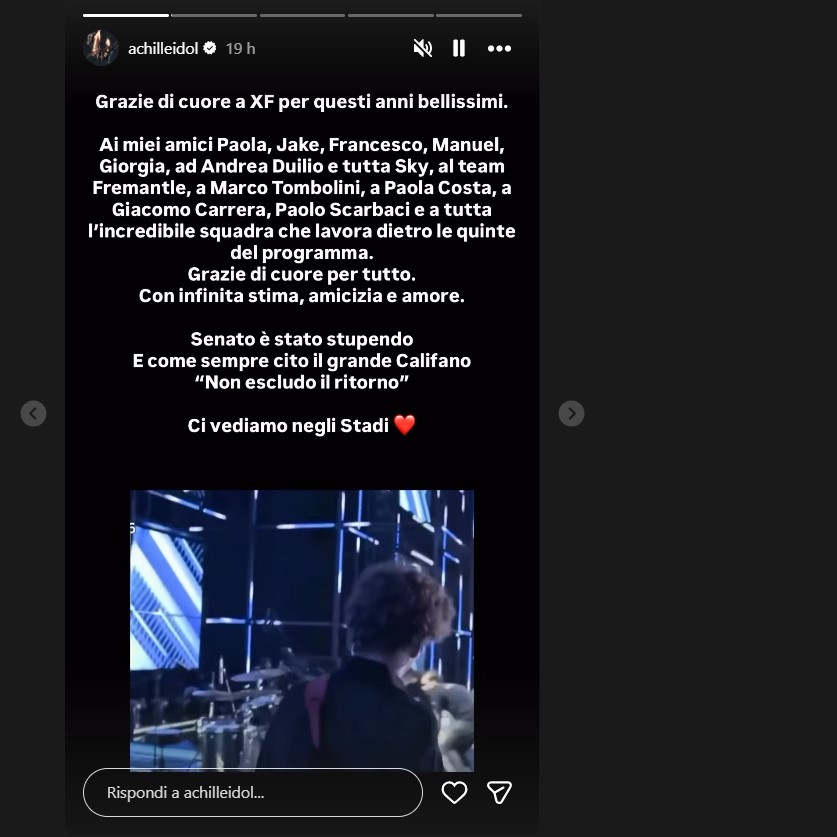 "Dopo due anni bellissimi a X Factor, con una squadra unica e momenti che non dimenticherò mai, la mia avventura nel programma si conclude qui. Mi trovo in un momento stupendo della mia vita. Tra un enorme tour negli stadi e l’amore travolgente che sto ricevendo, ho deciso di dedicarmi completamente alla musica e a chi in questi anni mi ha dato tutto. La musica è la mia casa. Scrivo canzoni da quando ero piccolissimo, ho sognato questo per tutta la vita e voglio dare tutto me stesso alla mia gente e a questo sogno".