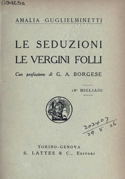 Del 1907 fu la sua seconda raccolta, più celebre: “Le vergini folli”. La Guglielminetti non scelse più la nota casa editrice Roux e Viarengo: ripiegò per una edizione meno prestigiosa e colse nel segno, ottenendo un successo inaspettato. Nello stesso momento il suo nome assurse a notorietà per la relazione tormentata intessuta con Guido Gozzano. Il “bel Guido” era il poeta torinese più noto, uno dei più significativi verseggiatori italiani. La Guglielminetti e il Gozzano si frequentarono, si piacquero, si lasciarono nel giro di poco. Lei era innamoratissima. Lui un po’ meno: gli piaceva essere al centro dell’attenzione di una donna, ma aveva timore di lasciarsi andare. E l’epistolario tra i due rivelò gli alti e bassi di una relazione mai iniziata ufficialmente. Il principale poeta crepuscolare fece un po’ la figura del “maestro”, iniziando la giovane allieva alla poesia: fu però uno dei più ardenti sostenitori de “Le vergini folli”. I due rimasero amici, e Gozzano rimase il suo interlocutore anche per la terza raccolta di versi, “Le seduzioni”, del 1909.
