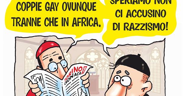 Altolà da parte dei vescovi africani alla benedizione delle coppie gay; Bergoglio non può far altro che prendere atto... Nella vignetta, i nostri sacerdoti, scherzano su un’ipotetica, surreale, accusa di razzismo.