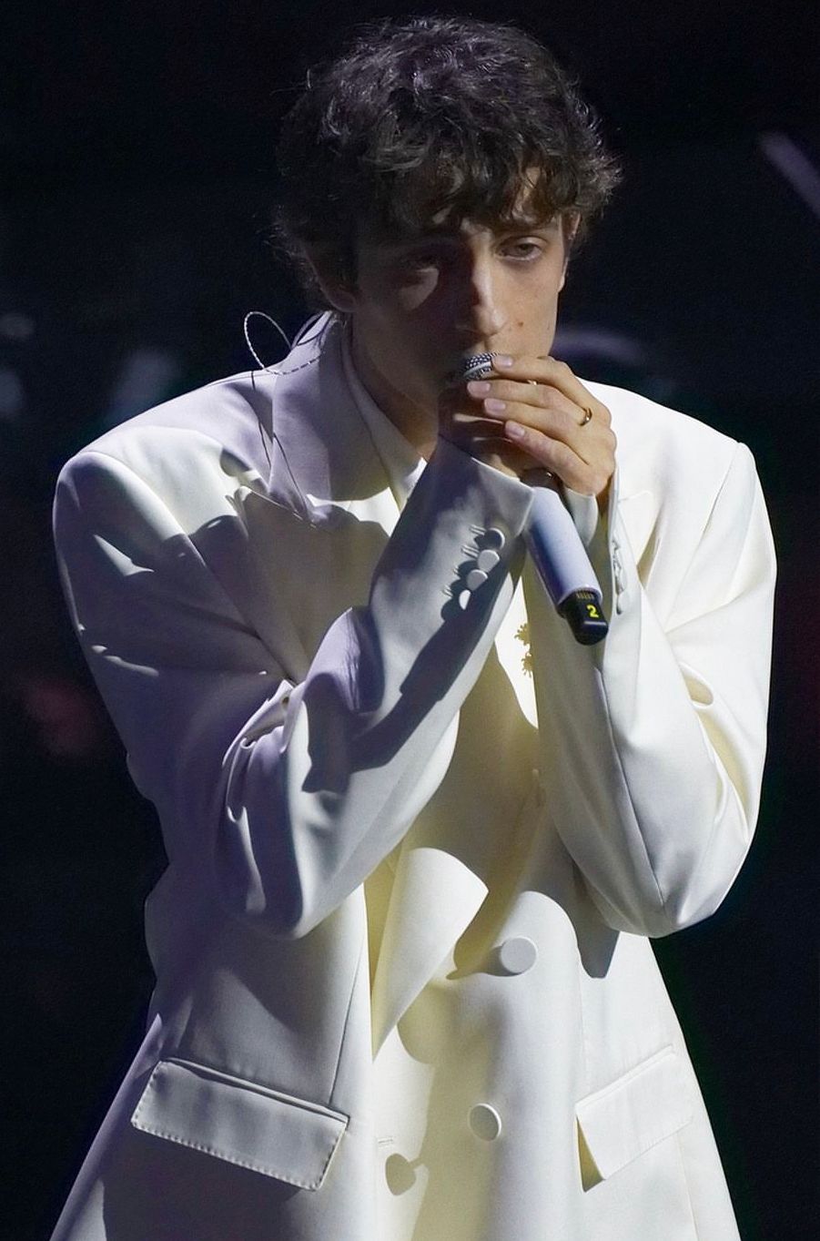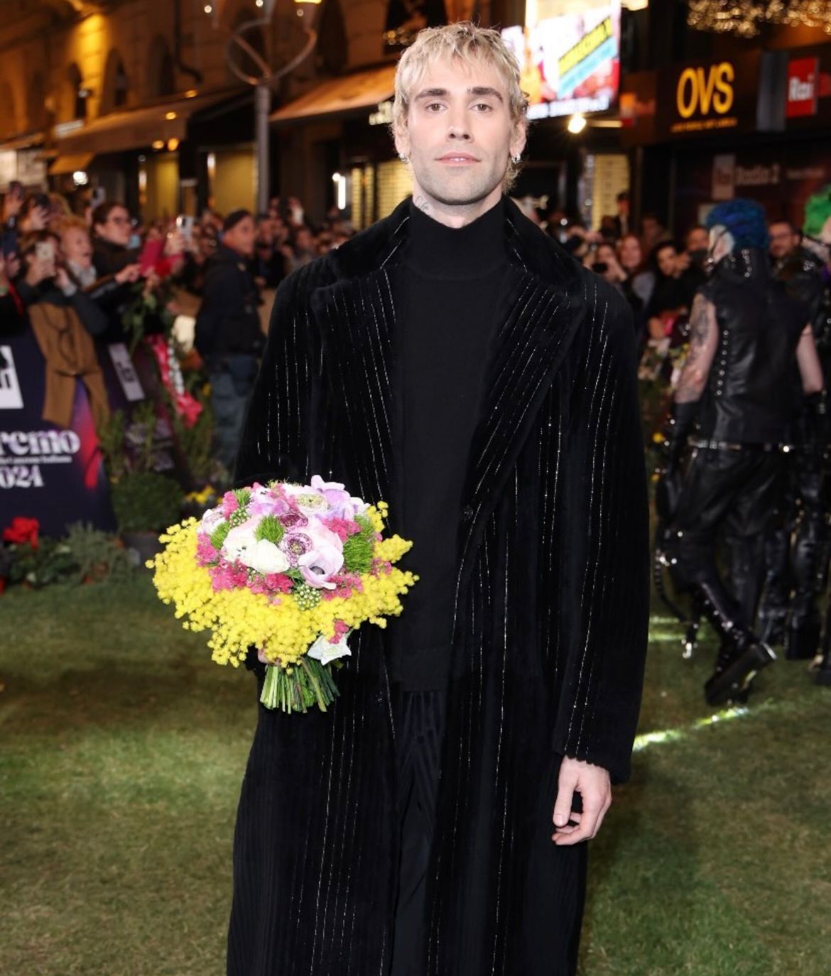 Il secondo a scendere le scale è Sangiovanni: elegantissimo, quasi irriconoscibile. Ha lasciato nell'armadio camicioni a quadrettoni e maxi felpe per scegliere un look total white, compresa la cravatta. "Bello, ma sembra il mio gelataio!" sono i primi commenti che si leggono sui social.