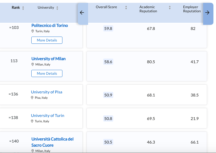 Il Politecnico di Milano si conferma la migliore università italiana, scalando nove posizioni e piazzandosi al 38° posto. Seguono l’Università di Bologna, la Sapienza di Roma e l’Università di Padova, tutte presenti nella top 100. Per quanto riguarda il Politecnico e l'Università di Torino, rimangono di poco fuori dalle prime 100 posizionandosi rispettivamente al 103° e 138° posto e rimanendo stabili rispetto agli anni precedenti. Questi risultati evidenziano comunque un continuo miglioramento delle università italiane, che stanno guadagnando sempre più riconoscimento a livello internazionale.