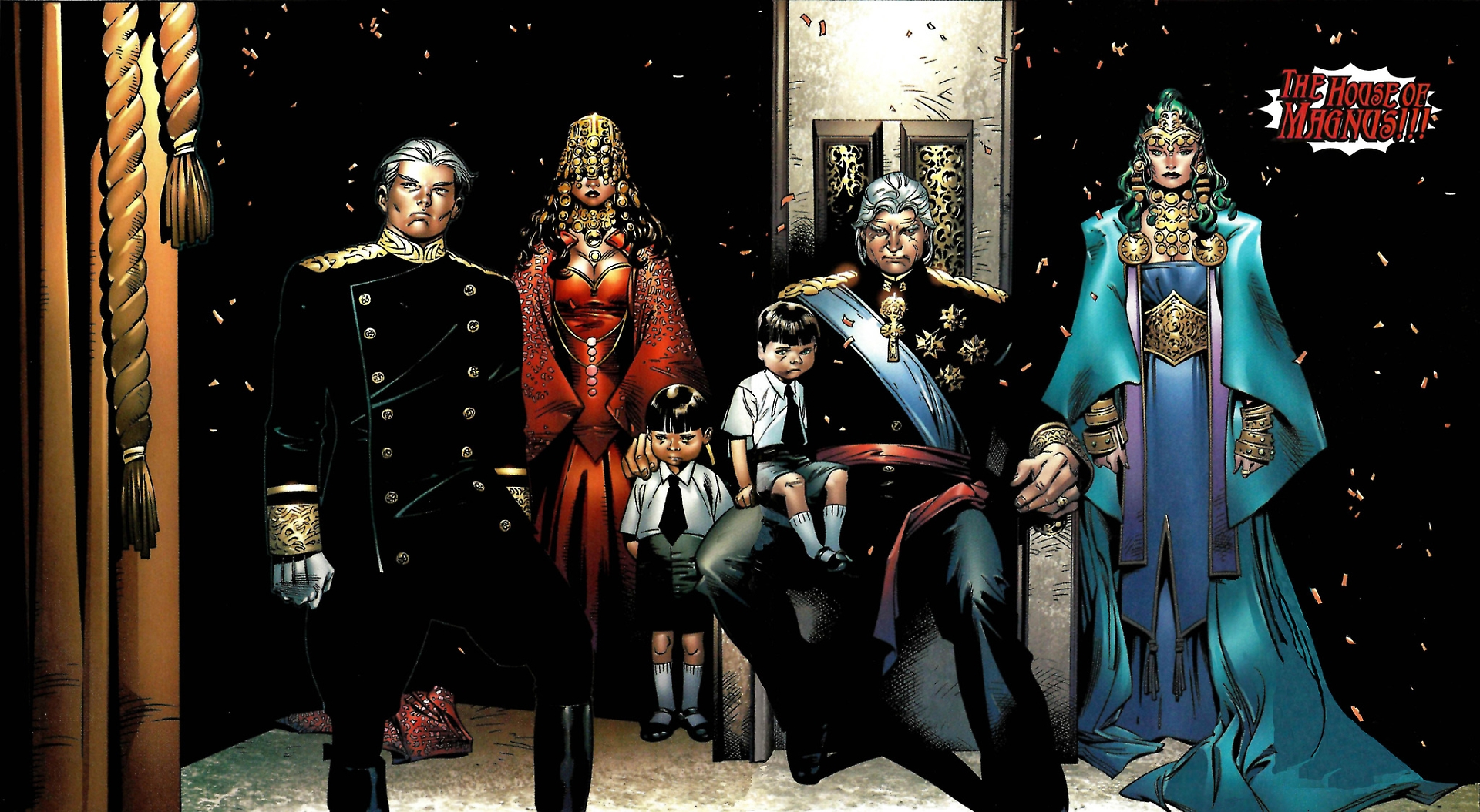 Partendo da sinistra: Pietro Maximoff (Quicksilver), Wanda Maximoff (Scarlet Witch), Tommy (Speed) e Billy (Wiccan) Maximoff, Erik Lehnsherr (Magneto) e Lorna Dane (Polaris); fumetto "House of M"