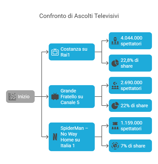 A completare il podio, Italia 1 con SpiderMan – No Way Home, che ha raccolto 1.159.000 spettatori e il 7% di share. Più staccate le altre proposte della serata: Lo Stato delle Cose su Rai3 ha interessato 853.000 telespettatori (5,2%), GialappaShow su Tv8 ha divertito 819.000 persone (4,8%), Quarta Repubblica su Rete4 si è attestato a 741.000 spettatori (5,1%), mentre La Torre di Babele su La7 ne ha totalizzati 755.000 (3,9%). Su Rai2 Obbligo o Verità ha registrato 609.000 telespettatori (3,5%), e sul Nove Cash or Trash – Chi Offre di Più? si è fermato a 361.000 spettatori (1,8%).