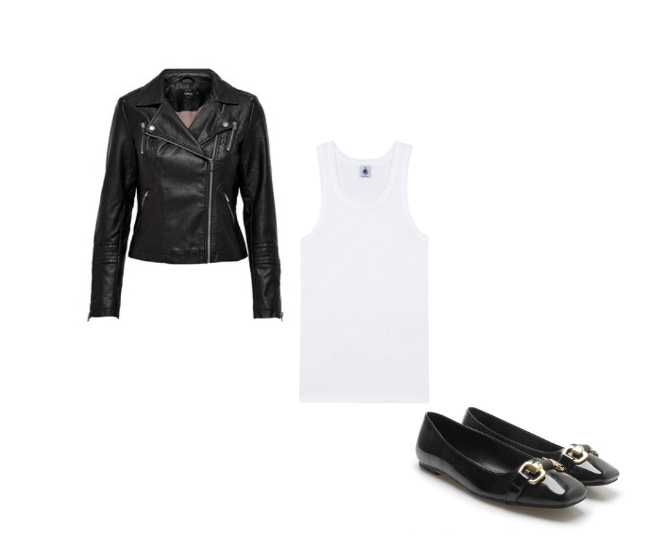 Il look monocromatico è sempre una buona idea. Per la primavera 2025, l'accoppiata vincente prevede: canotta bianca, giacca in pelle nera, pantaloni full black e ballerine coordinate. A spezzare, una borsa marrone cuoio che aggiunge personalità. Perfetto per un brunch o un aperitivo al tramonto.