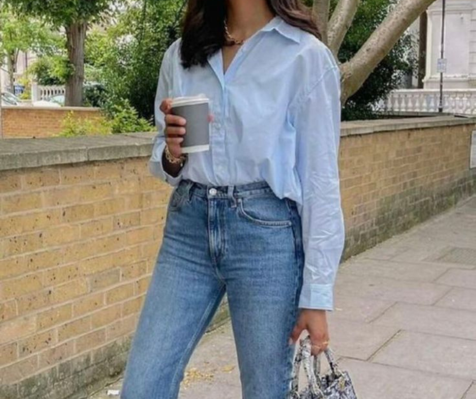 Camicia azzurra di lino e jeans chiari conservano un'eleganza senza tempo. Come scarpe, spazio alla fantasia: mocassini in camoscio o scarpe da barca in tonalità soft come pistacchio, beige o caffè.