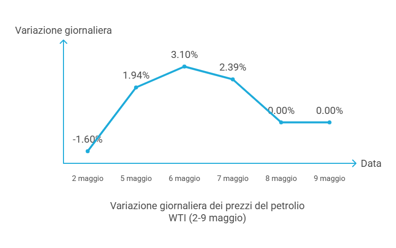 Nell'ultima settimana (Investing.com), il prezzo del WTI ha mostrato una leggera tendenza al rialzo, passando da 58,29 USD il 2 maggio a 60,34 USD il 9 maggio.Il Brent ha seguito un andamento simile, salendo da 61,29 USD a 63,28 USD nello stesso periodo.Questi movimenti riflettono una certa stabilità nei mercati petroliferi, nonostante le recenti decisioni dell'OPEC+ di aumentare la produzione e le incertezze legate alle trattative sul nucleare tra Stati Uniti e Iran, che potrebbero influenzare l'offerta globale di greggio.