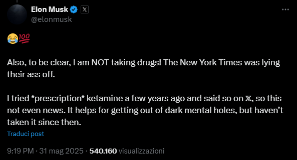 In un post su X, Musk ha respinto con decisione le accuse contenute nell’articolo del Times, che descrive una vita privata caotica, tra figli avuti da numerose donne e presunti abusi di sostanze psicotrope. «Il New York Times mente spudoratamente», ha scritto. «Ho provato la ketamina prescritta qualche anno fa, come ho detto pubblicamente, ma non l’ho più assunta da allora. Mi ha aiutato a uscire da momenti bui, ma non è più parte della mia vita».
