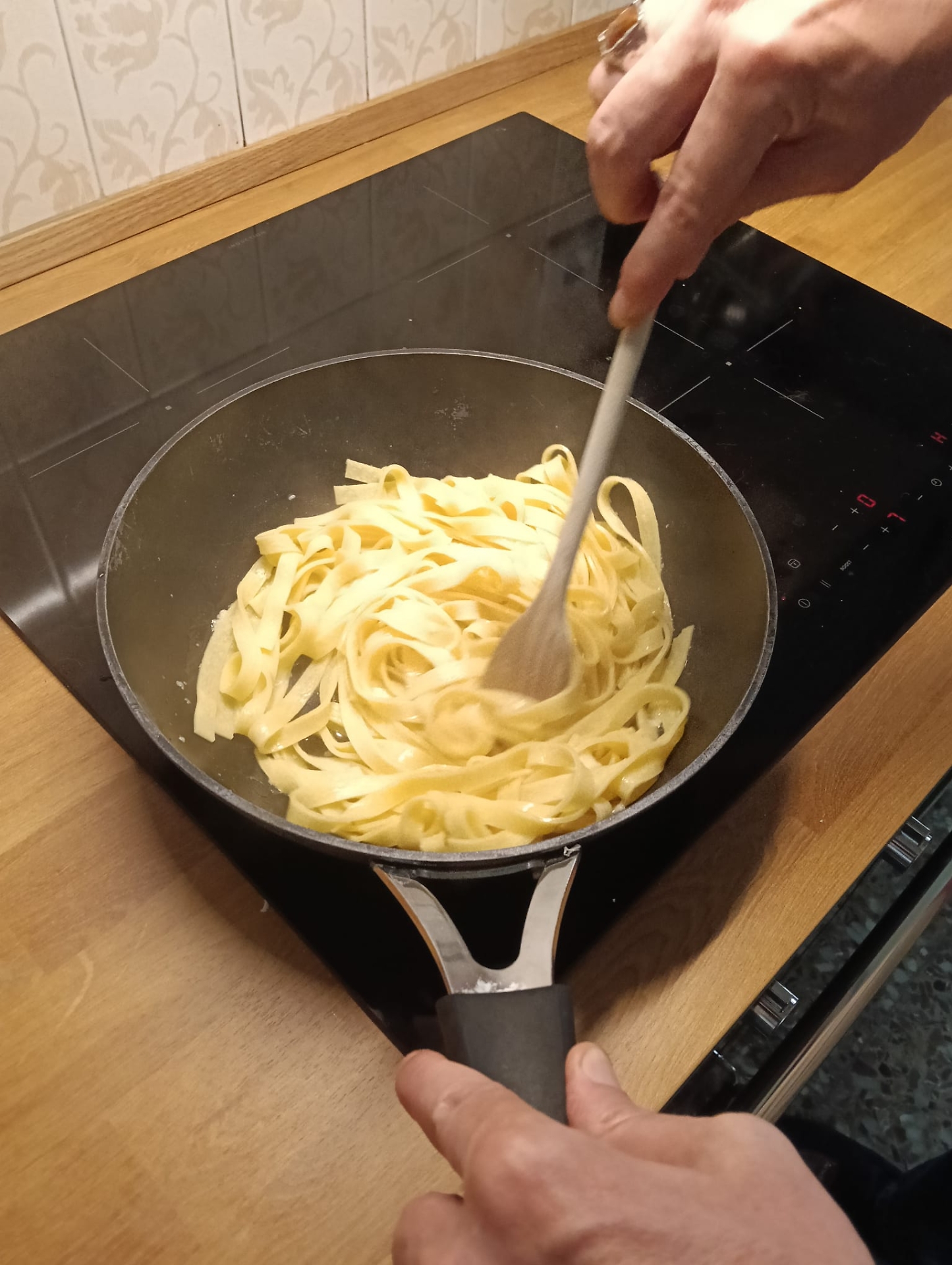 Bisogna arrivare a una giusta cremosità, senza grumi e senza bruciacchiature. Buttiamo pure la pasta nell'acqua bollente, ricordando che basta un minuto per la cottura, mentre mantechiamo la crema semplicemente muovendo la padella a bassa intensità di cottura (per chi usa il piano a induzione). Per un risultato eccellente, usiamo l'acqua di cottura, in quantità non eccessiva. E aggiungiamo pepe.