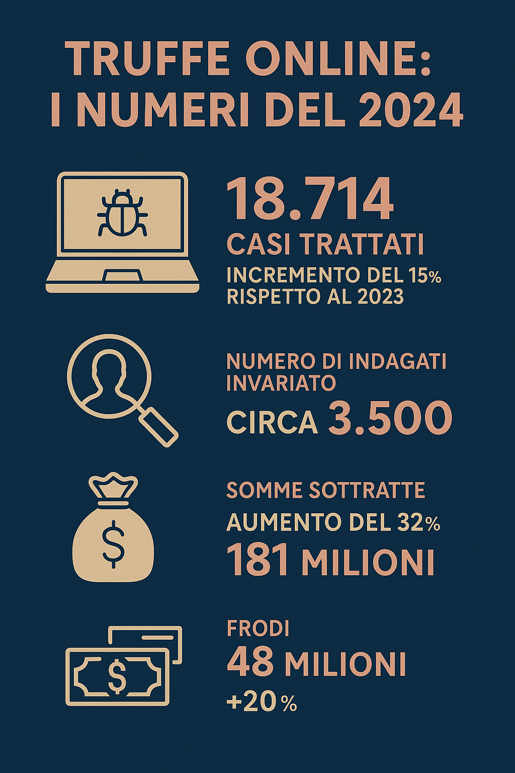 Lo scorso anno le truffe online hanno toccato numeri record in Italia: 18.714 i casi trattati, con un incremento del 15% rispetto all’anno precedente. Le somme sottratte sono salite del 32%, raggiungendo 181 milioni di euro, e a questi si aggiungono 48 milioni di euro di frodi digitali (+20%).