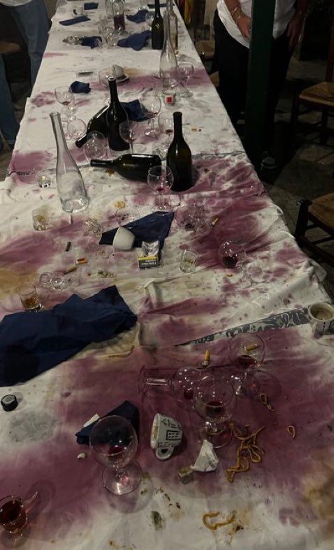 La foto, diffusa su Instagram da Alessandro Rosica, mostra una lunga tavolata ridotta a un campo di battaglia: tovaglie intrise di vino, bicchieri rotti, bottiglie vuote rovesciate, mozziconi di sigaretta abbandonati sul tavolo e tazzine di caffè rovesciate. Una scena che, secondo molti utenti, tradisce un totale disprezzo per il luogo e per il lavoro di chi lo gestisce.