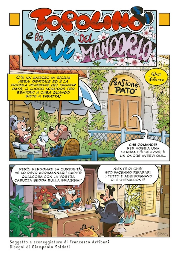 Sul numero 3640 del settimanale Topolino, disponibile in edicola e su Panini.it da oggi, torna Topalbano con una nuova avventura intitolata Topolino e la voce del mandorlo, sceneggiata da Francesco Artibani e disegnata da Giampaolo Soldati. La storia, ricca di colpi di scena, collaborazione e rispetto per le tradizioni, immerge fin dalle prime tavole i lettori nelle atmosfere tipiche dei romanzi camilleriani.