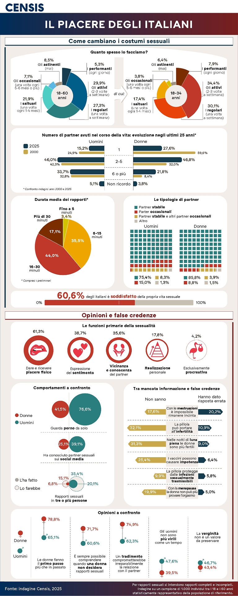 Come è cambiata la sessualità degli italiani? Ce lo dice il rapporto «Il piacere degli italiani. Come cambiano i costumi sessuali» realizzato dal Censis sugli italiani tra i 18 e i 60 anni: uno straordinario affresco del ruolo e del significato sociale della sessualità e delle trasformazioni intervenute a 25 anni di distanza dall’ultima grande ricerca sui comportamenti sessuali degli italiani.